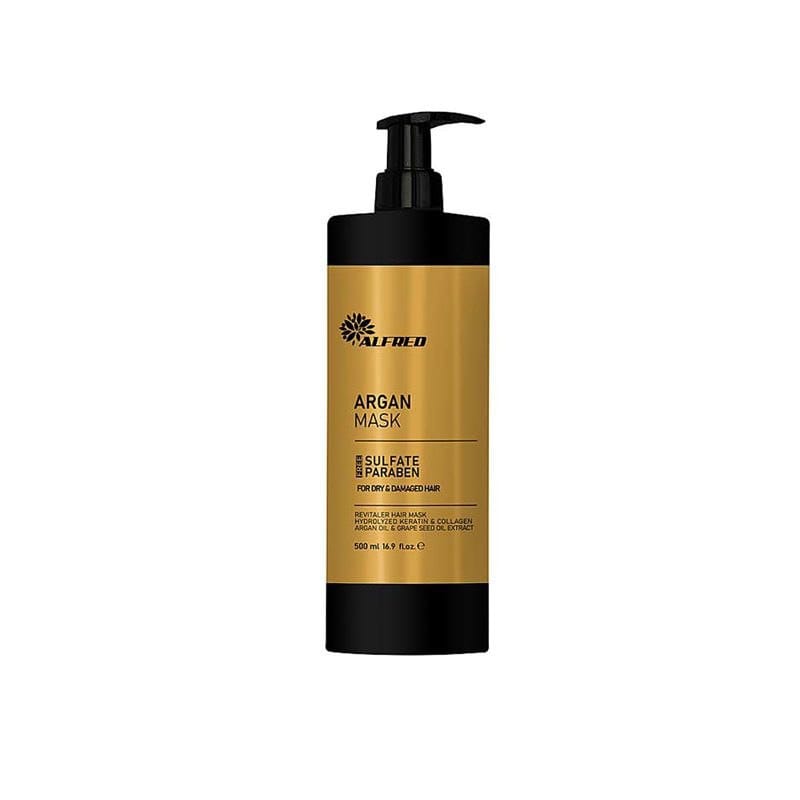 ماسک موی آلفرد مدل آرگان، فاقد سولفات و پارابن، با ترکیب روغن آرگان، کلاژن و کراتین هیدرولیزشده، مناسب برای موهای خشک و آسیب‌دیده. نرم‌کننده، آبرسان و ترمیم‌کننده با حجم ۵۰۰ میلی‌لیتر.